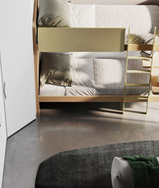 Solução para quartos partilhados ou com espaço limitado. O beliche com secretária incorporada maximiza a funcionalidade, enquanto o closet de canto e o roupeiro garantem mais arrumação.